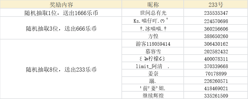 随机抽取8位,送出233乐币