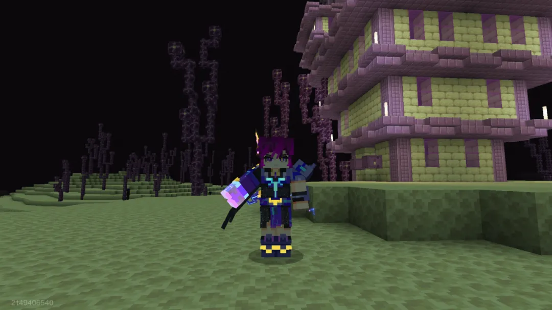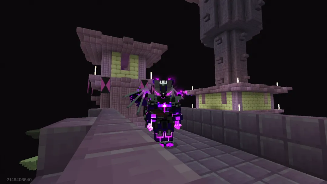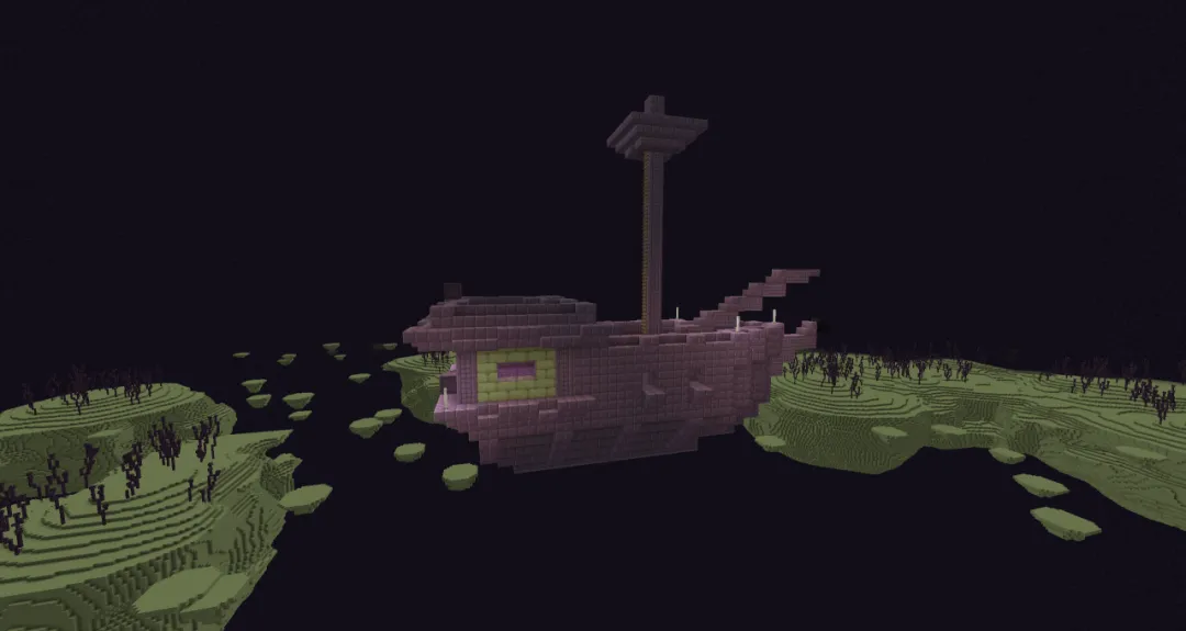 百无聊赖中,我细细打量起眼前的巨船。这船同样是由紫色与象牙色的材料构建而成,但诡异的是——它完全没有任何外置动力,却静悄悄地飘在空中,任由末影人们上上下下,却纹丝不动。
