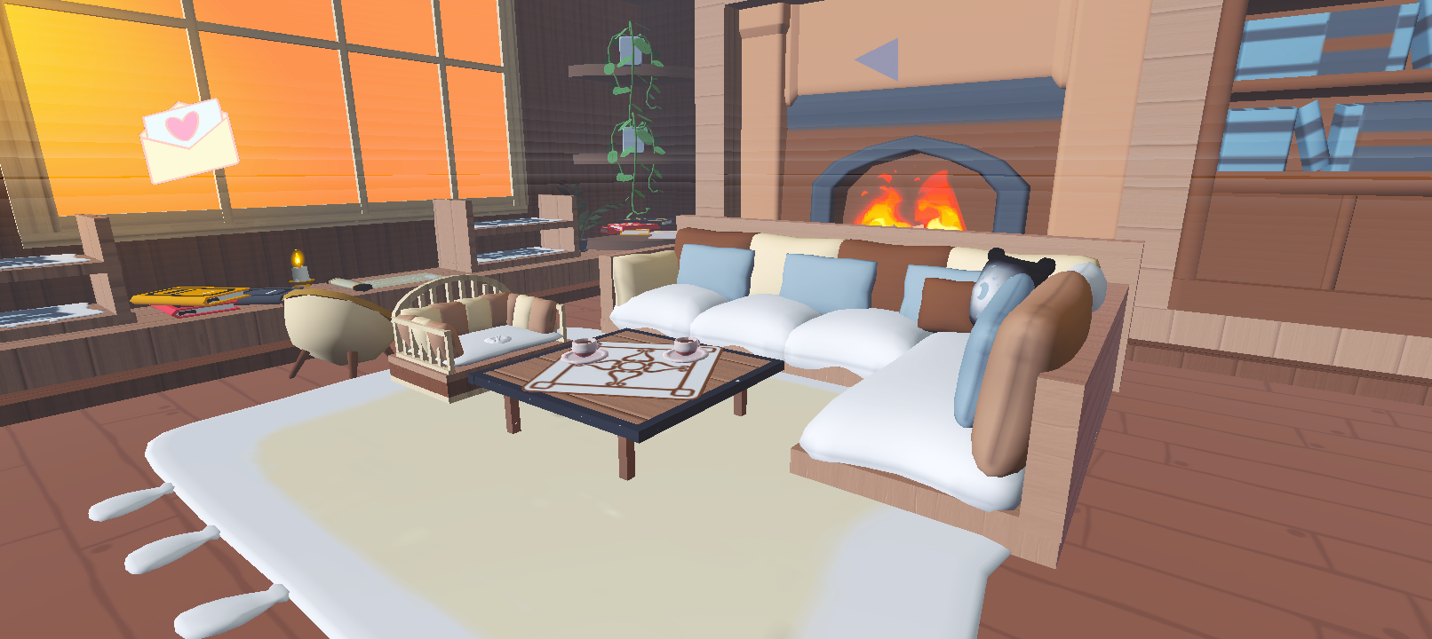 当然,作者也做了温暖的地方!作为一张冬系打卡图,可不能用纯的白色,当然还是要有温暖的小木屋,作者这里做的也很还原,沙发茶几应有尽有,连炉子里的火也点了,桌布上更是细节满满,看来作者也是个注重细节的人,人体给人的感觉就是温暖大气,简约,这里还是相当推荐的🎁