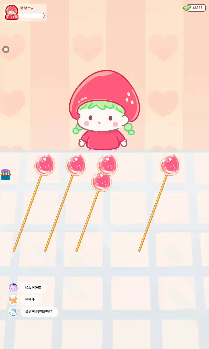 更新宠物!!! 「你进行草莓糖葫芦吃播的话,我就赞助100元。」 「脆口的声音太迷人了(°θ°)」 由于客人都被最近新开的许多糖葫芦店家抢走,曾经号称糖葫芦达人的父母因此卧病在床。 继承父母店面的主角露露开始糖葫芦吃播来宣传店面。 直到成为真正的糖葫芦达人那一天! 「今天我也要开始糖葫芦直播罗!( •o• )」 [串材料] 只有新鲜的水果的话,很难以一名吃播实况主存活下来。还要有松饼、地球软糖、青阳辣椒!利用奇特的材料制作糖葫芦吧。 [裹糖衣] 将材料串满竹签的话,就放进锅子搅动吧。唯有利用达人的秘法,才能裹出又薄又脆的糖衣。 [即时吃播] 咔哒咔哒!今天的吃播也大成功。热烈的聊天内容看起来反应也不错。看来得利用完成观众任务得到的赞助金来买新材料了! 来,准备好了吧?现在就马上挑战成为糖葫芦达人吧!