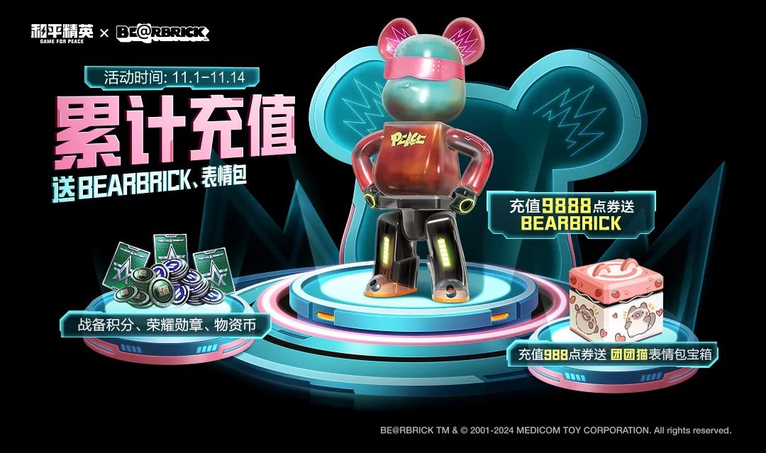 累计充值988点券时,可将团团猫表情包宝箱收入囊中;累计充值达到9888点券时,炫酷潮流的BEARBRICK就属于你啦~
