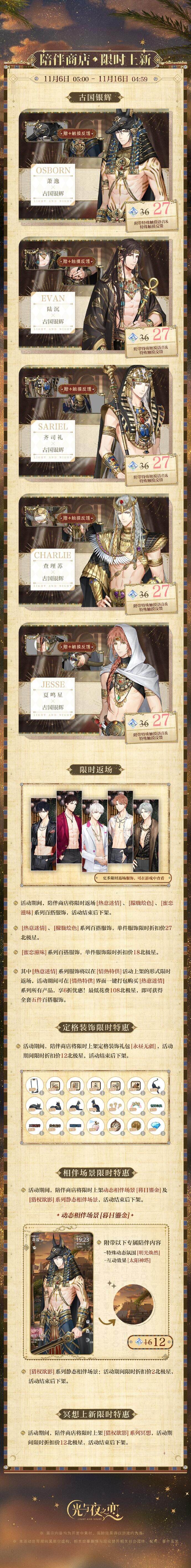 ✦ 11月6日 05:00 - 11月16日 04:59期间,陪伴商店将限时上新[古国银辉]系列百搭服饰、定格装饰礼包[永昼无疆]、动态相伴场景[暮日鎏金]及[猎权欲影]系列静态相伴场景、[猎权欲影]系列冥想,活动结束后下架。