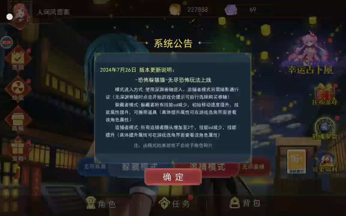 《躲猫猫模拟器》是一款休闲竞技对抗游戏。拥有非对称对抗玩法的同时,加入了实时追逃躲藏玩法。强化了实时互动对抗性。游戏模式也延续一代的躲藏者与抓捕者双模式,让玩家体验两种不同的乐趣。4V1的逃脱者模式,让4个逃脱者联合起来一起对抗boss,寻找宝石打开医院大门逃脱。在游戏中可以体验到实时竞技对抗与敌人斗智斗勇的乐趣,也可以感受到画面音效对恐怖氛围的渲染,让玩家感受全新的心跳体验。多变的策略玩法,丰富的角色道具选择,都让游戏更加经久耐玩令人回味无穷!