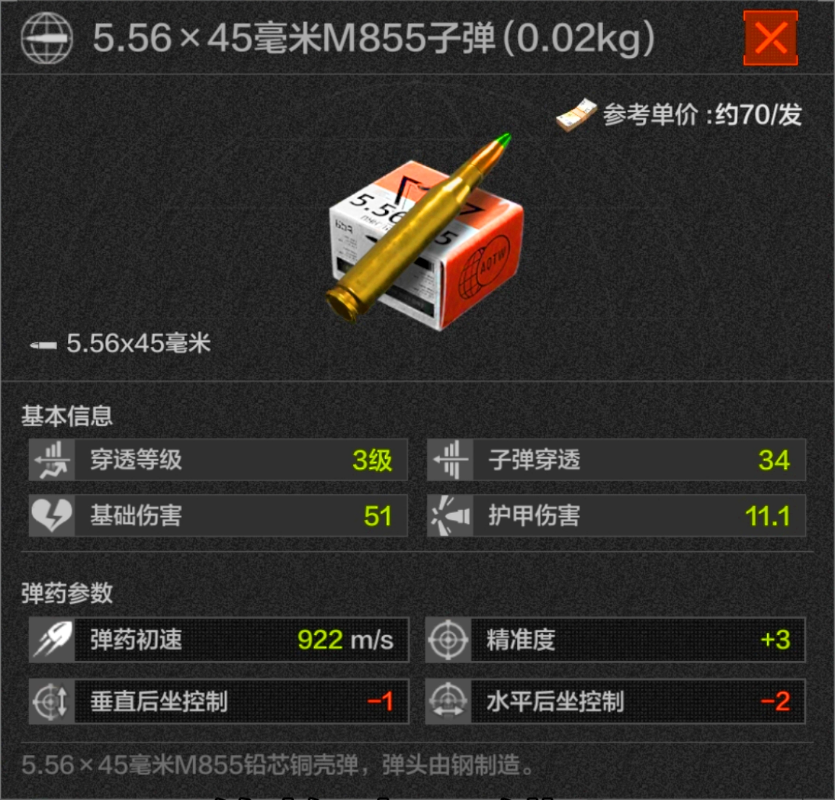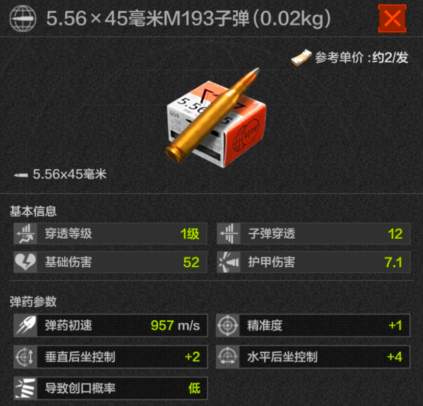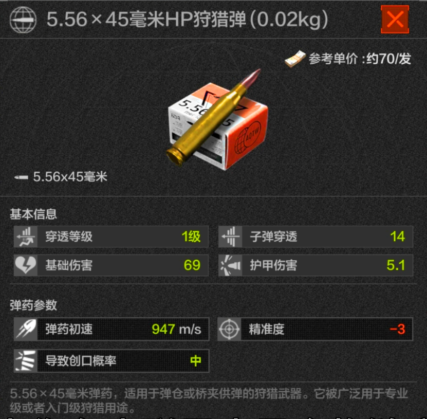 3级弹,可以说是5.56子弹在自己级别当中最稳定的选手了,除了强化封锁都可以拿出来打一打,价格也不错,摸到可以拿一拿,也可以从人机身上进货。