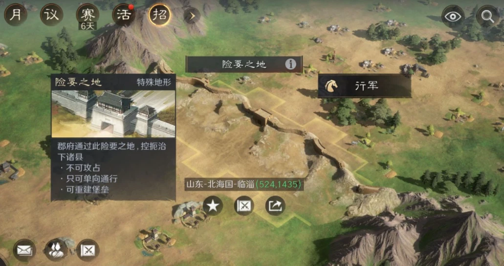 「险要之地」为新增特殊地形。一面是峭壁,一面是缓坡,从缓坡方向可通行,从陡坡方向不可通行,且不可被攻占。