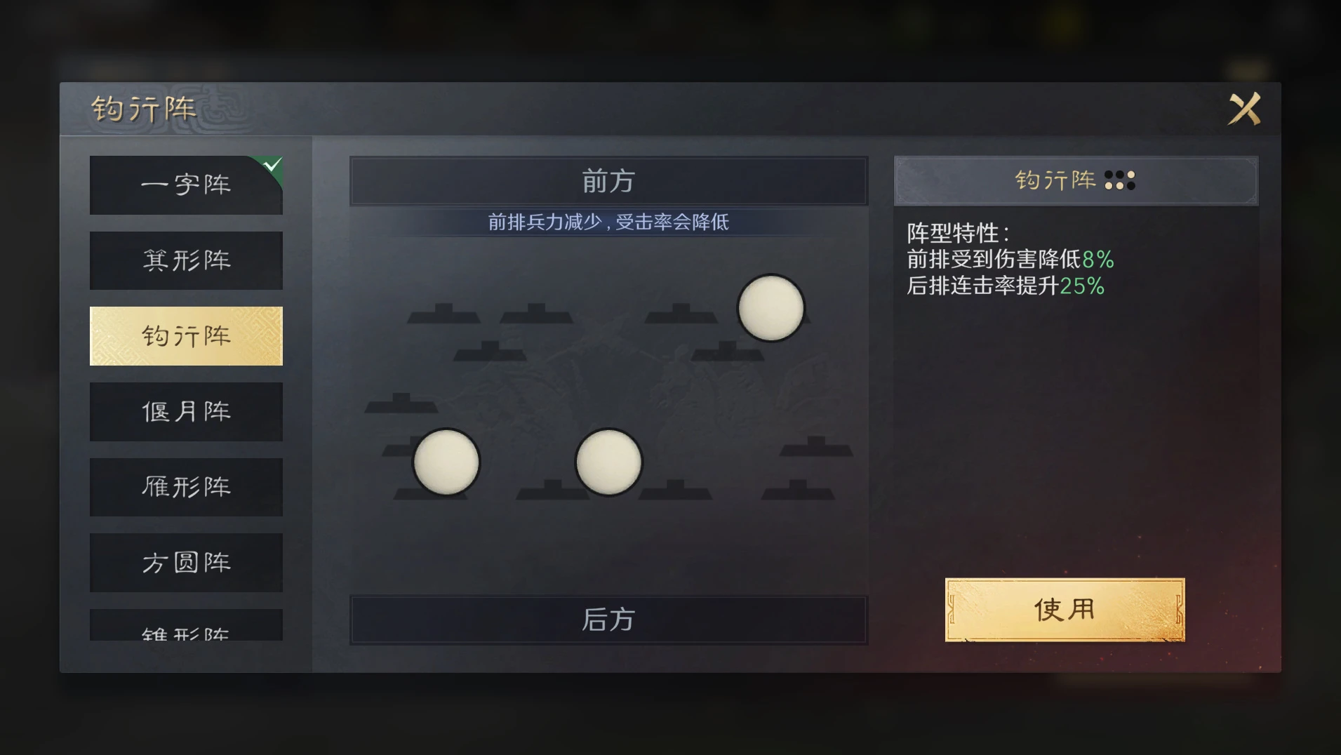 阵型特性:前排受到的伤害降低8%;后排连击率提升25%