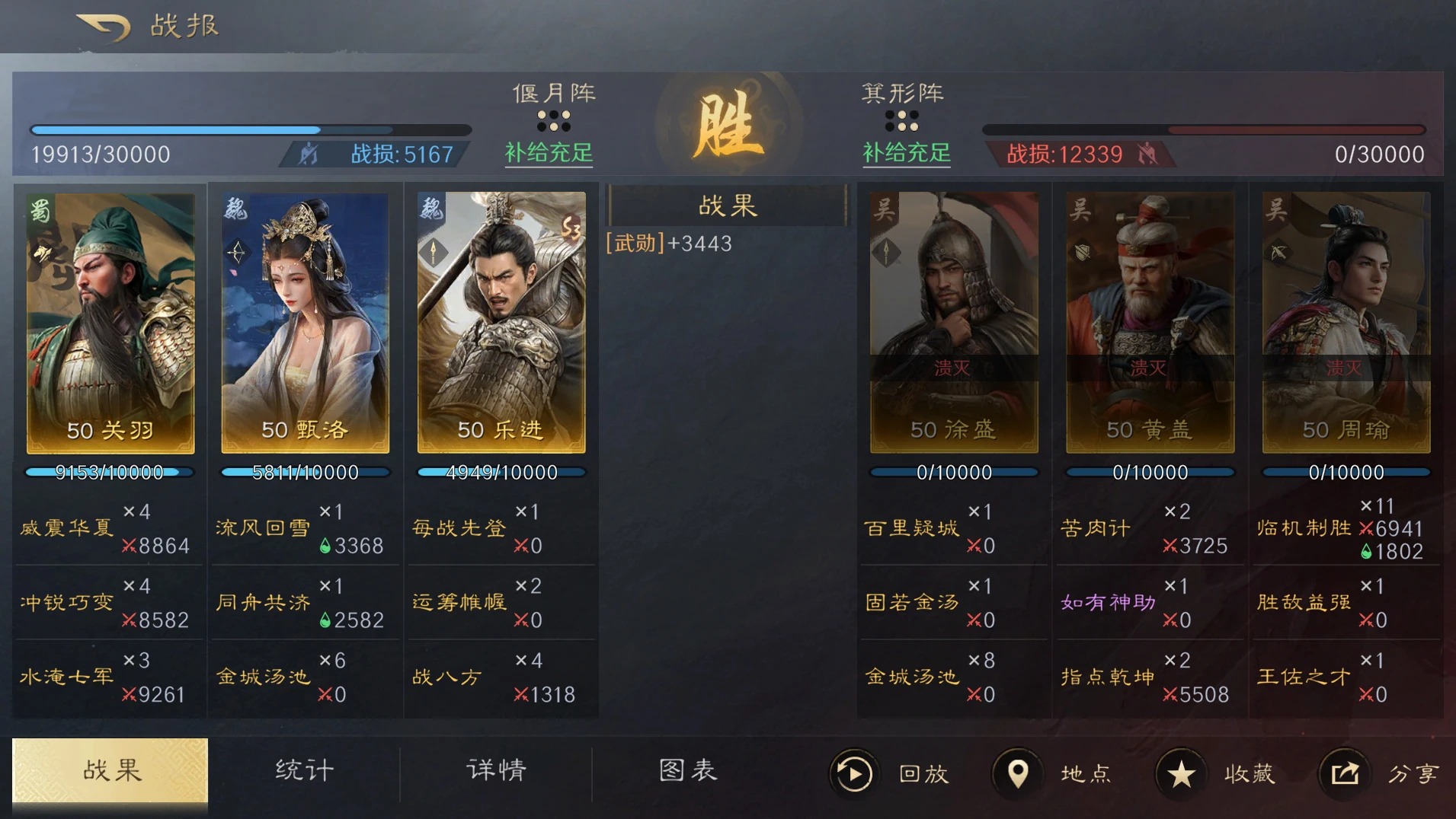 依靠乐进【每战先登】在前排的额外加成效果,提高关羽的伤害和先攻,在依靠自身的高先攻一速挂上【战八方】的畏惧,保障关羽【威震华夏】的启动,关羽带上【冲锐巧变】补足伤害的同时,让【水淹七军】跳过准备回合直接释放,打出伤害和群体控制,从而达到胜利