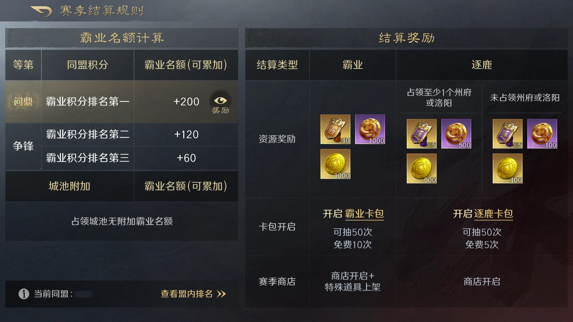 赛季结算阶段,同区服内获得霸业积分最高的同盟将会获得问鼎奖励。结算时间内在该同盟的同盟玩家也将获得赛季问鼎奖励。