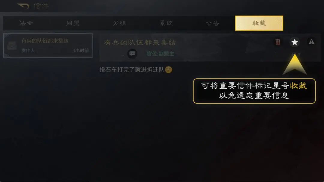 信件系统主要分为6种,分别是:法令、同盟、分组、系统、公告、收藏,下面给大家逐个介绍信件系统的区别。