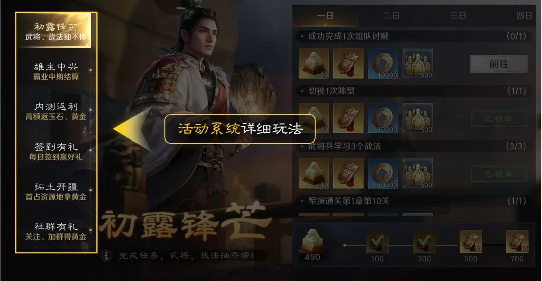 在刚进入游戏时开区活动非常丰富,分别是:“初露锋芒”、“虎视中原”、“签到有礼”、“拓土开疆”、“社群有礼”,以下为大家介绍活动系统详细玩法。