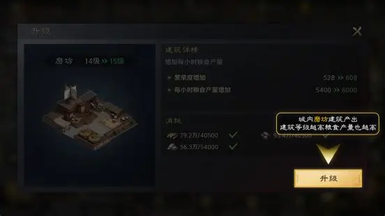 城内磨坊建筑,可产生粮食,随之建筑等级升高,获取粮食产量也会升高。