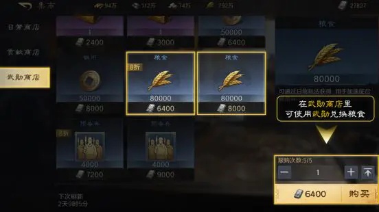 商店里有日常商店、贡献商店、武勋商店区分,每个商店都可以获取粮食,需要对应的资源兑换。