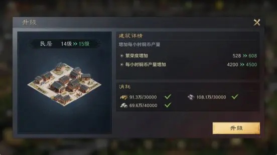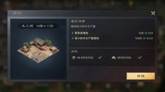 城内木工所可以获取木材,木材源源不断。随之建筑等级提升,木材产量也会倍增。