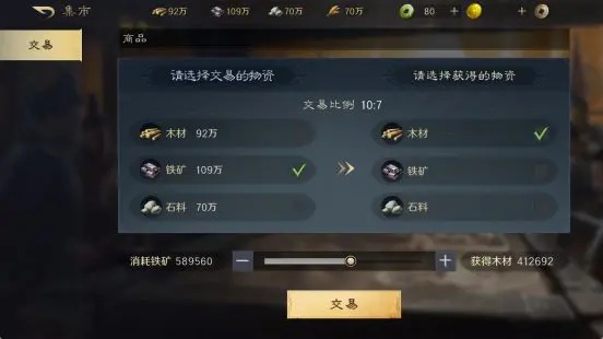 玩家还可以在主城的集市内进行资源交易,可以使用铁矿、石料资源换取木材,按比例换取。