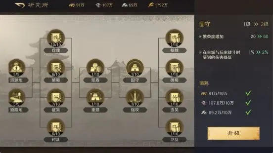 玩家可以在城镇研究所中,升级属性,不仅可以增强玩家武将的战斗力,还可以增加玩家城池属性,进攻和防守都得到提升。