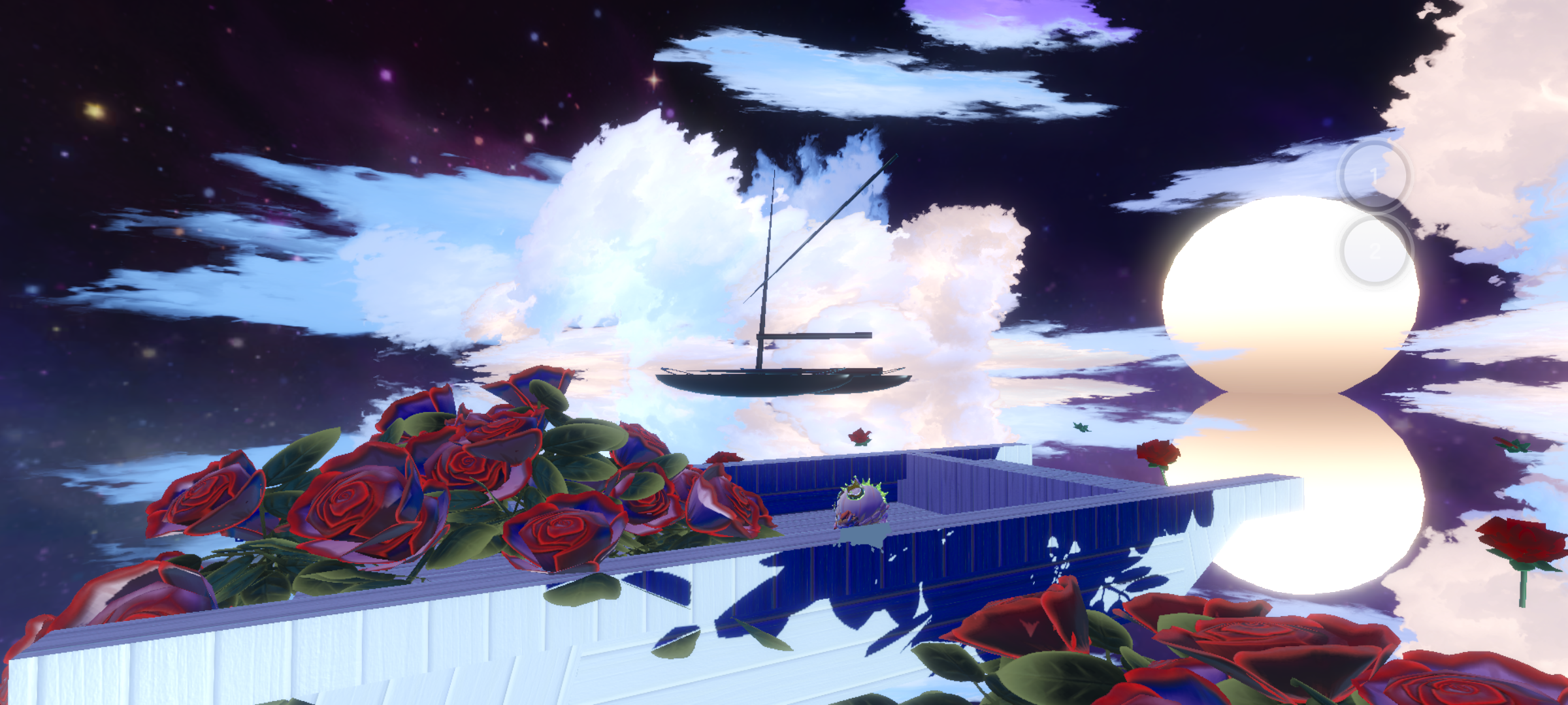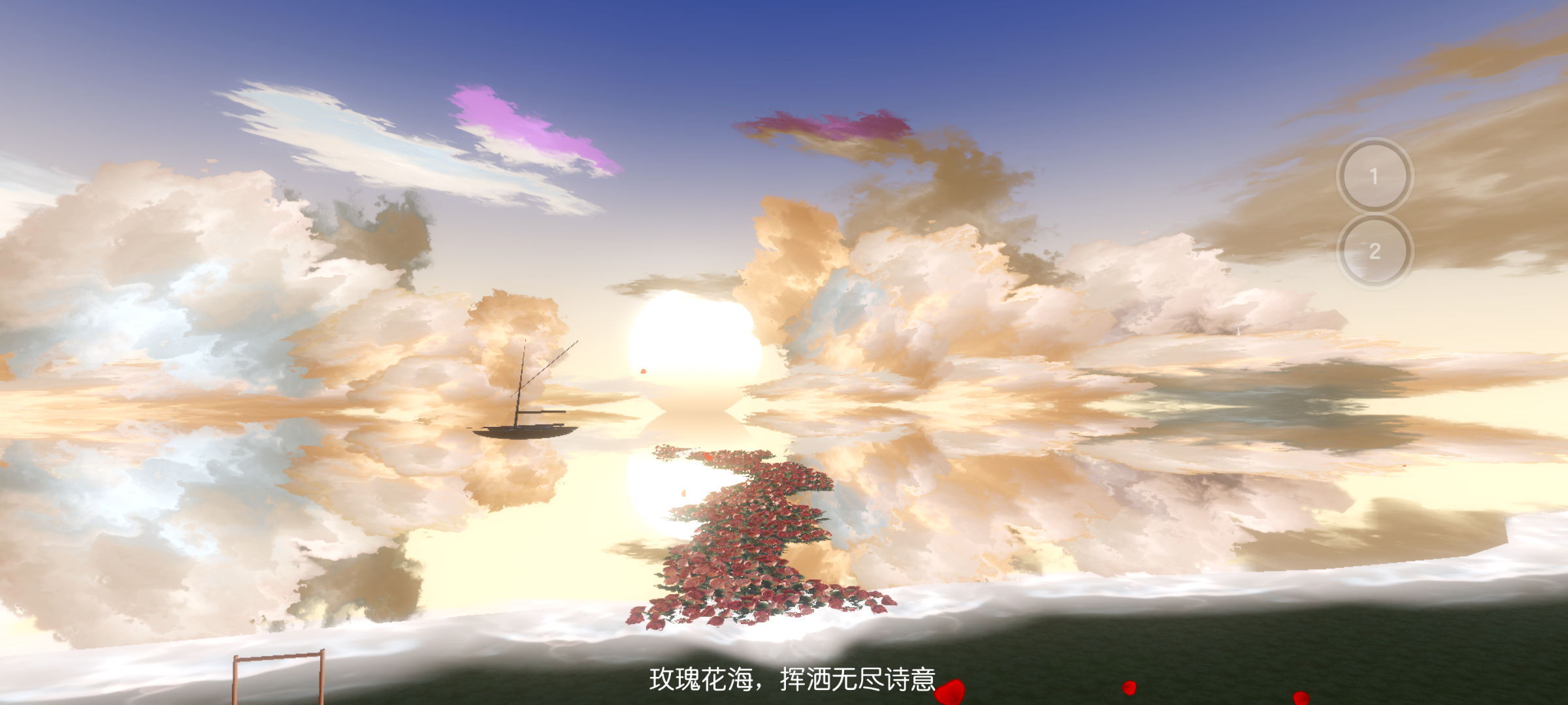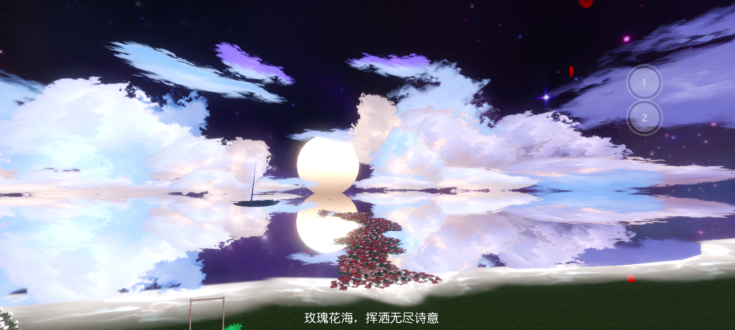 “闻道孤山未有梅,春娇早已艳玫瑰”这里就是起始点啦~是一片玫瑰花海呢 ✨可以有黃昏和黑夜两个场景,切换场景只需点左上角的两个按扭就ok啦😉