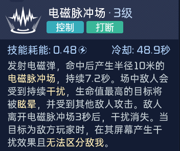 二技能是释放电磁弹,看到他的耗能和冷却时间就应该能想到这个技能的强大了,可以持续对半径十米内的敌人进行干扰,生命值最高的不仅会被眩晕,还会被其他敌人,也就是他的队友攻击,范围内的敌人都无法区分敌我,如果是一些范围型的武器,比如说榴弹炮,那简直就是伤敌一千自损八百了,所以说这把武器pvp真的很强。