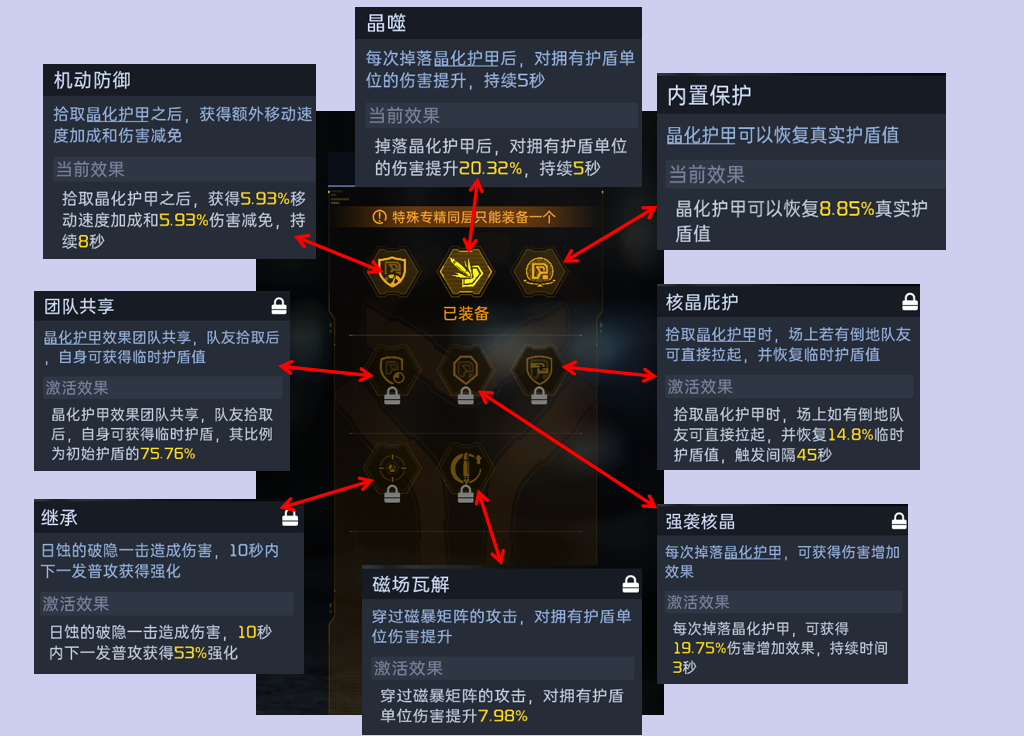 第一层推荐晶噬,来提升对拥有护盾单位的伤害,觉得容错率低的,可以选择机动防御,增加移速和伤害减免,内置保护个人认为作用有些偏低,不过打pvp的时候可以选择携带,用于恢复护盾值。