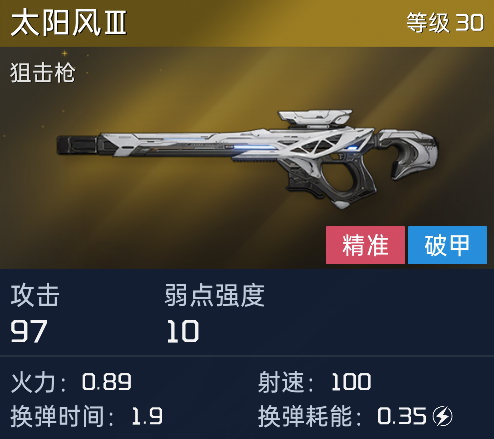 太阳风是一把连狙,通过持续瞄准还可以增加普攻威力,他的单体爆发很高,全武器最佳也不为过,大地图探索的时候,用于远处刷怪非常有效,pvp强度也不低,叠满buff伤害就是一枪秒,缺点就是依靠命中率,打不中伤害再高也没辙。