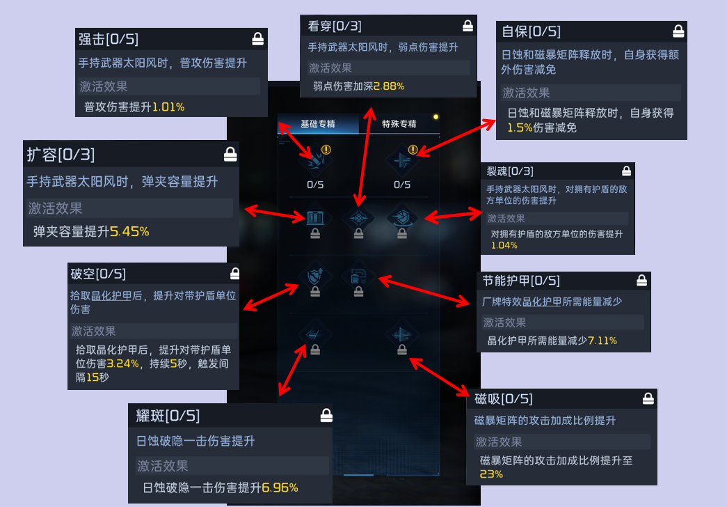 第二层推荐主点看穿,提高弱点伤害,因为第二层每点只能提升三次,所以可以选择副点魂裂,打副本还是打pvp都可以增加对有护盾单位的伤害,扩容不太推荐,有源码的加成在,子弹基本是够用的,没必要在多扩了。