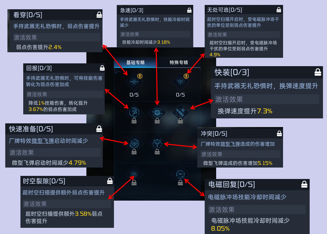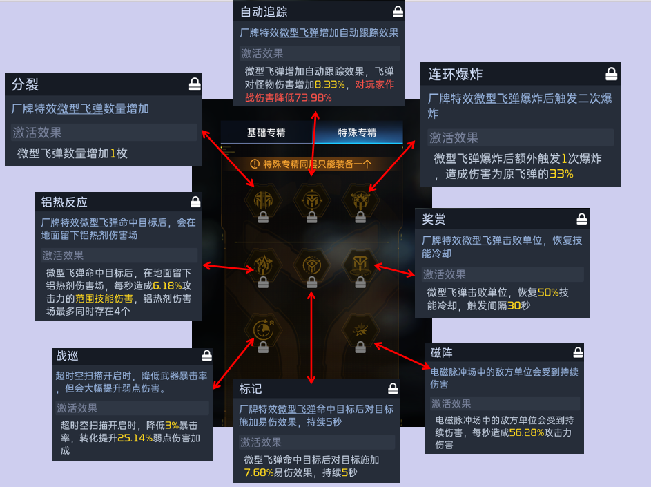 第三层推荐冲突,单纯增加伤害就好,启动时间减少看似可以更快的触发,但是不可能卡着每次时间结束刚好就发射,即使如此,伤害效率也仅仅提高5.03%(用专精前和专精后的时间伤害效率计算),对比直接造成伤害也还是低了0.12%,虽然时间减少可以削减对于命中率低带来的负面影响,但是作为狙击枪,肯定是无法做到持续输出的,所以直接提升伤害性价比最高。