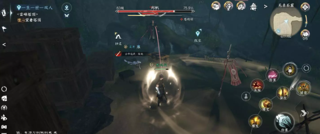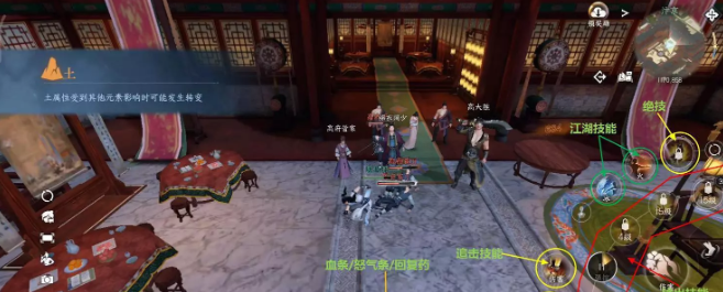 以手机举例,左侧为摇杆区,负责控制玩家的上下左右移动。右侧为技能区,玩家可以携带5个职业技能,右上方为轻功按钮,右下方为燕回风。最右侧为望气技能。正中间显示玩家的血条和怒气条(蓝条)。