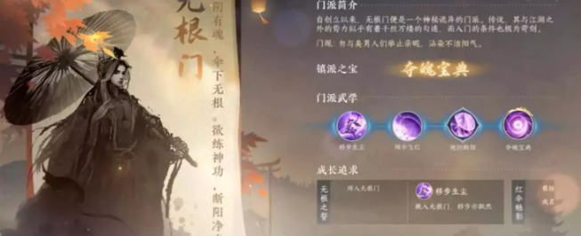 玩家除了流派以外还可以加入江湖势力的门派,目前已知的江湖门派有无根门、相思门、龙门客栈、丐帮、平天门等,每个江湖门派都有独特的技能可以修炼,不过都有入门派的一些门槛,比如无根门是“欲练此功,必先自宫”,相思门的相思剑法则是必须与异性同时修炼等。
