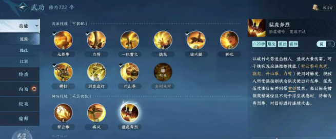 玩家可以通过完成各种任务或者抽卡的形式来抽取江湖技能,江湖技能种类繁多,大致可以分为下面四种:伤害类,回复类、防御类、控制类。每种玩法搭配的江湖技能也不同,比如铁衣打本带两个防御类的江湖技能用来减伤,打PVP则可以带控制类技能和回复类技能来增加控制能力和生存能力等。