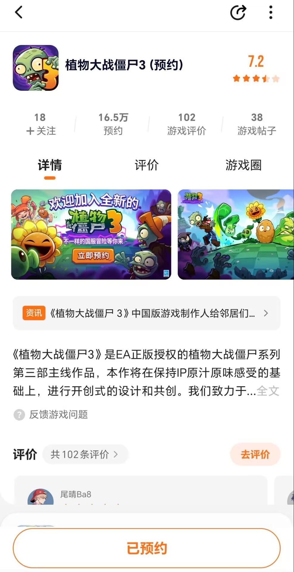 ②在这个帖子评论你对《植物大战僵尸3》国服的期待或建议,并带上已预约截图;