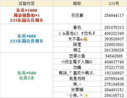 随机抽取1名,送出【乐币*1000+周边钥匙扣*1+233乐园会员周卡】
