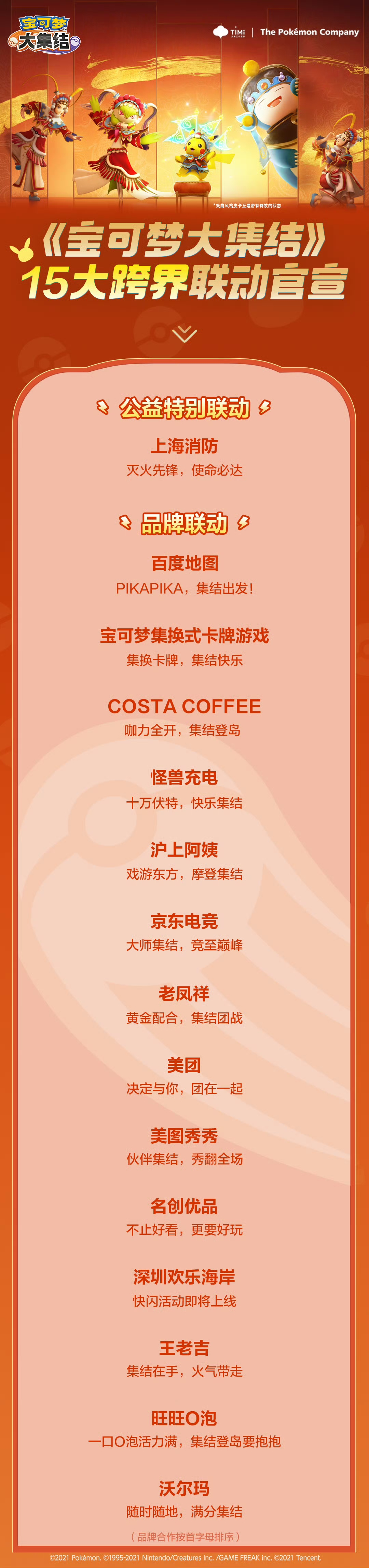 除了游戏世界,我们也希望,可爱治愈的宝可梦们,也能在现实世界中,与训练家们不期而遇。为此,我们和上海消防、百度地图、宝可梦集换式卡牌游戏、COSTA COFFEE、怪兽充电、沪上阿姨、京东电竞、老凤祥、美团、美图秀秀、名创优品、深圳欢乐海岸、王老吉、旺旺O泡、沃尔玛等品牌跨界联动,让宝可梦能和中国粉丝们在现实中也一起快乐集结,轻松生活不上火,可爱的宝可梦们陪伴在你身边。