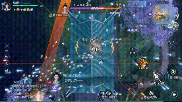 通过地面阶段后就是飞天阶段,时刻注意躲避技能,不断调整自身位置。上天以后除了正常射出音刃攻击外,记得使用获得内力屏障技能,有3秒的无敌时间,此外燕回风也能够无敌0.5秒,副本过程中需灵活运用。