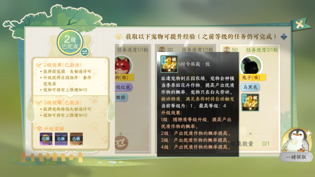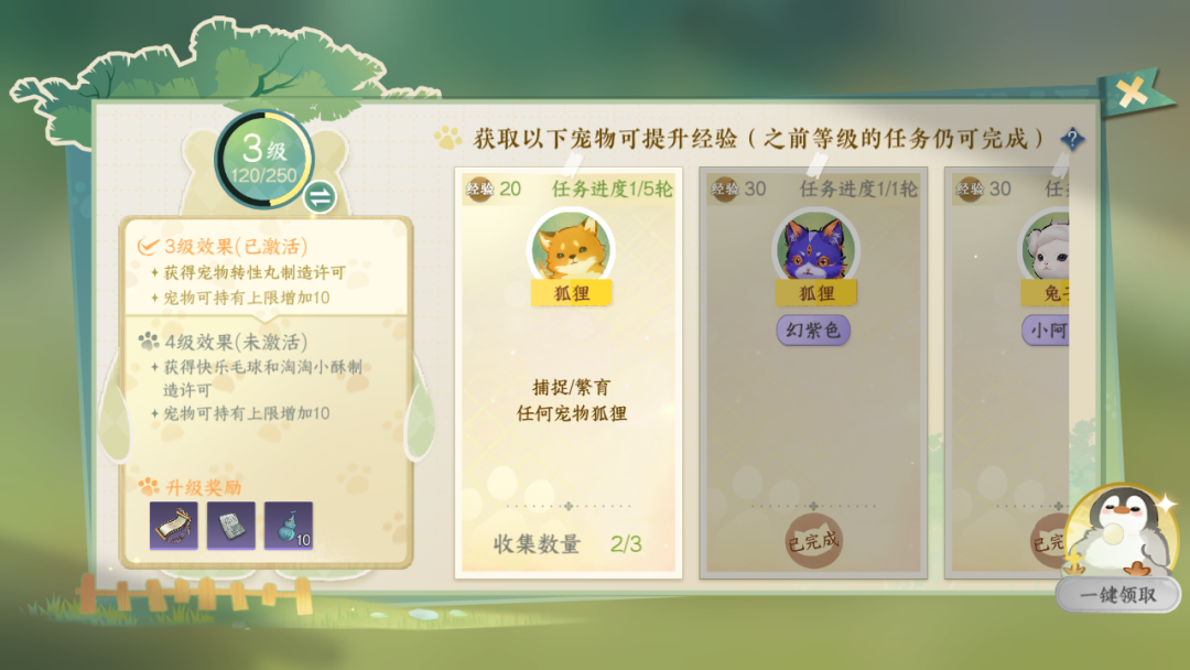 1、优先升级宠物图鉴,可提升捕捉宠物的概率,提升拥有宠物数量上限,并解锁更高级的捉宠葫、可改变性格的【萌宠性格百变丸】等等,还能获得一大批精美配饰!宠物图鉴中,部分简单任务可以重复完成来获得经验快速升级,不需要完成所有任务。