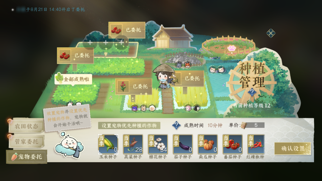如果您能合理安排不同特质的宠物,甚至可以实现庄园的全面增产与全自动生产:例如将负责播种、灌溉、收获的不同宠物分配在同一块农田中,就能全自动完成从播种到收获的全流程!