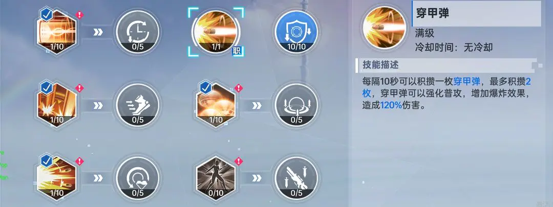 职业技能:核心技能为穿甲弹。穿甲弹:每隔10秒可以积攒一枚穿甲弹,最多积攒两枚,穿甲弹可以强化普攻,获得爆炸效果,并且额外能力升满可以使被命中的目标防御力降低。