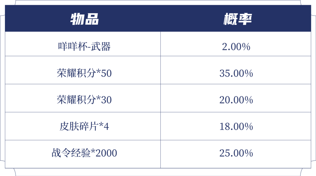 购买酷炫机甲(1日),可额外获赠一个礼包,打开后可随机获得以下之一:荣耀积分*50、荣耀积分*30、皮肤碎片*4、战令经验*2000、咩咩杯-武器。累计50次必得咩咩杯-武器。