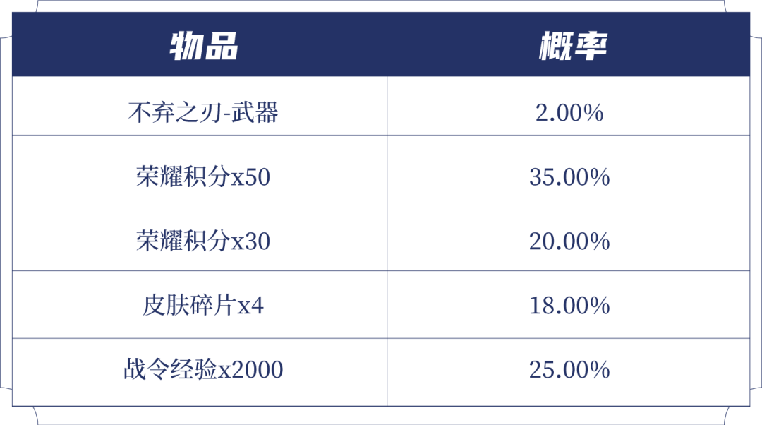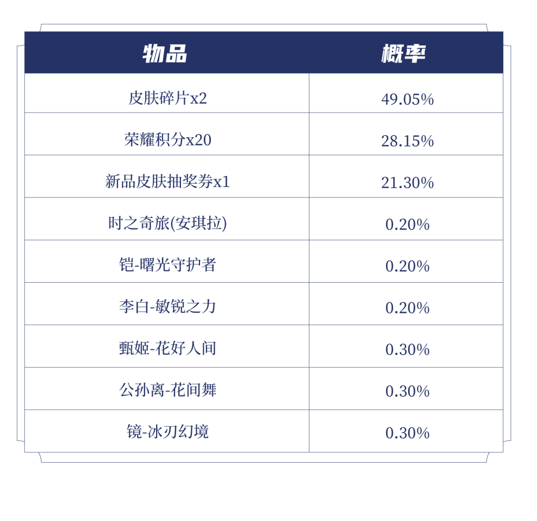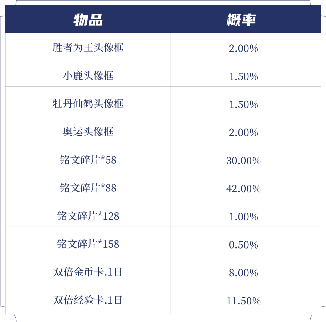 打开后可随机获得以下奖励之一:胜者为王头像框、小鹿头像框、牡丹仙鹤头像框、奥运头像框、双倍金币卡:1日、双倍经验卡:1日、铭文碎片x158/128/88/58。