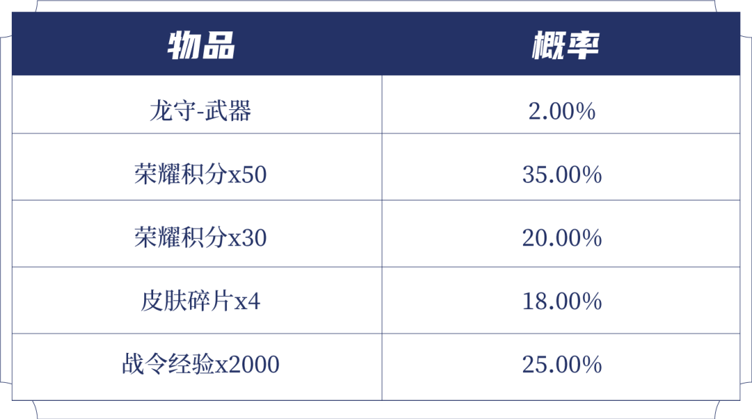 购买酷炫机甲(1日),可额外获赠一个礼包,打开后可随机获得以下之一:荣耀积分x50、荣耀积分x30、皮肤碎片x4、战令经验x2000、龙守-武器。累计50次必得龙守-武器。