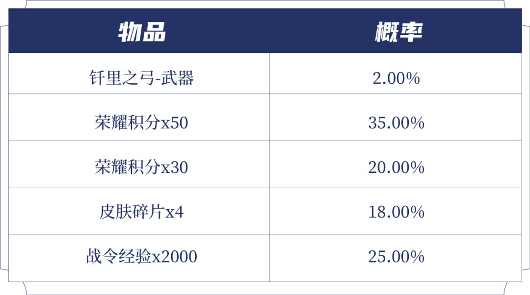 购买酷炫机甲(1日),可额外获赠一个礼包,打开后可随机获得以下之一:荣耀积分x50、荣耀积分x30、皮肤碎片x4、战令经验x2000、钎里之弓武器。累计50次必得钎里之弓-武器。
