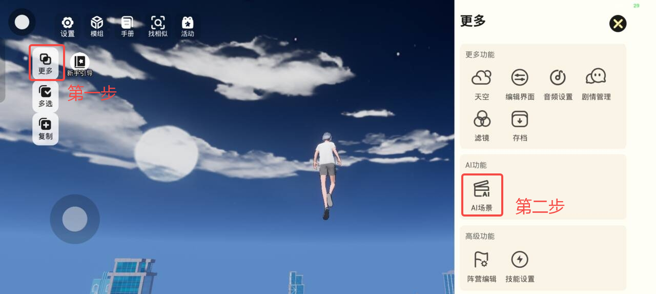 方法2:1分钟自动生成地图场景。点击【更多】-【AI场景】,