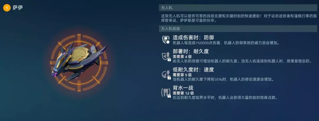 新无人机“萨伊”除了固有的耐久值加成外,还为俄菲翁提供了额外的防御点数以及低生命值时的移动速度提升效果。使俄菲翁拥有极高的容错率。