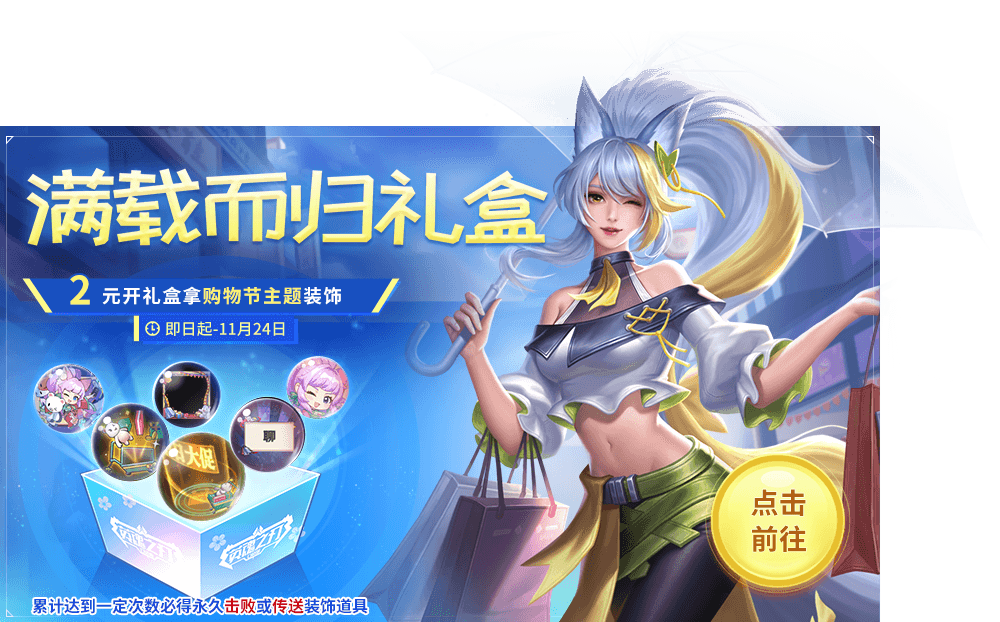 花费20点券可购买满载而归礼盒(不可交易),打开必得茶杯投影1天体验卡,并有机会获得满载而归传送、购物狂欢击败、购物主题头像框、头像、铭牌、聊天框、积分、钻石夺宝券等道具。