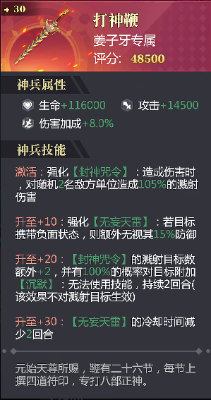 30级神兵能使【无妄天雷】CD减少2回合,加强姜子牙持续作战的能力