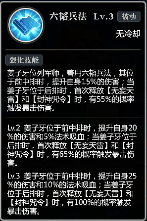 技能4:【六韬兵法】此技能让姜子牙置于不同站位能获取不同的加成,放置于前中排时能获取25%增伤与10%法术吸血。放置在后排则能让其首次使用【无妄天雷】与【封神咒令】时暴击率提升100%。