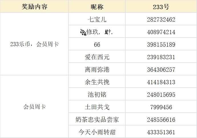 再从剩余的两个阵营抽取5名玩家,每人送出233会员周卡1张!