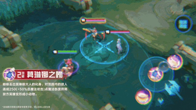 娜娜丢出莫琳娜大人的化身,对范围内的敌人造成250(+50%总魔法攻击)点魔法伤害并将敌方英雄变形成小动物。