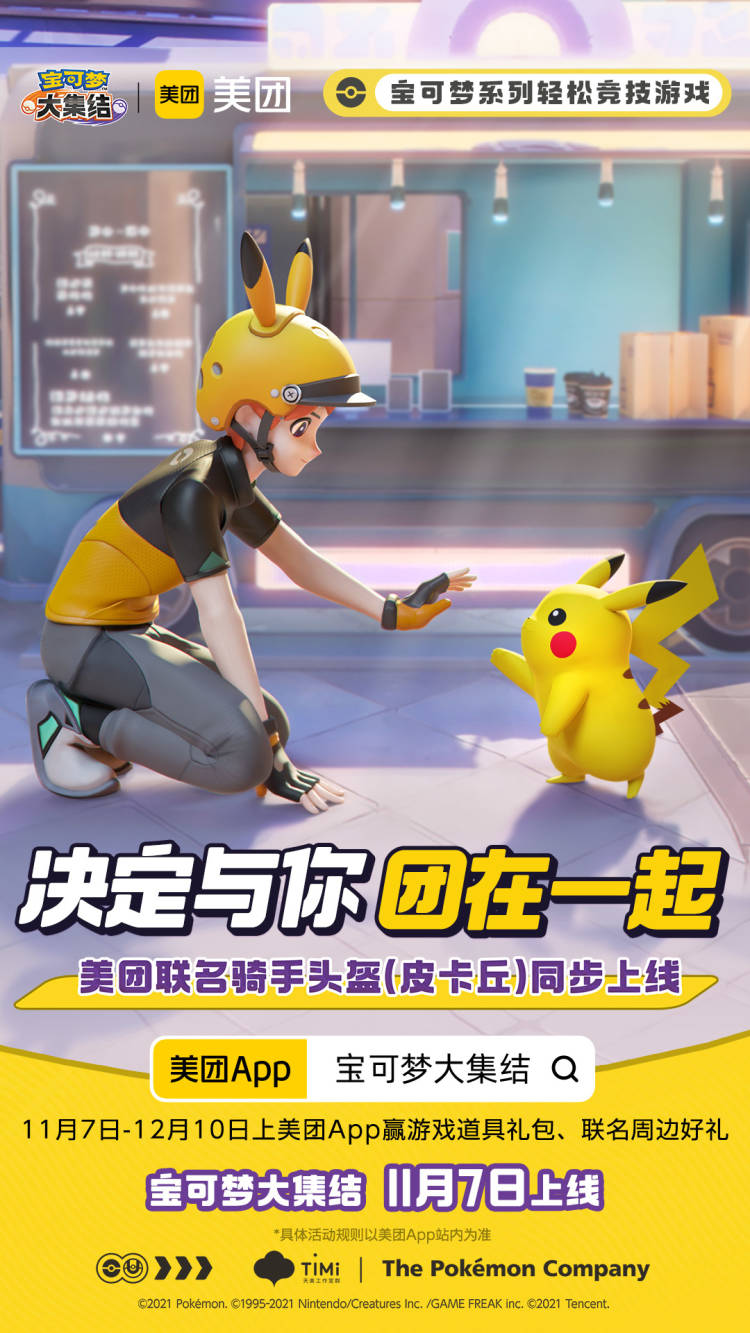 决定与你,团在一起!宝可梦大集结丨美团联动开启,登岛和宝可梦一起完成外卖订单,get联名定制骑手头盔(皮卡丘)~11月7日-12月10日,美团��宝可梦大集结,赢游戏道具礼包、联名周边好礼!