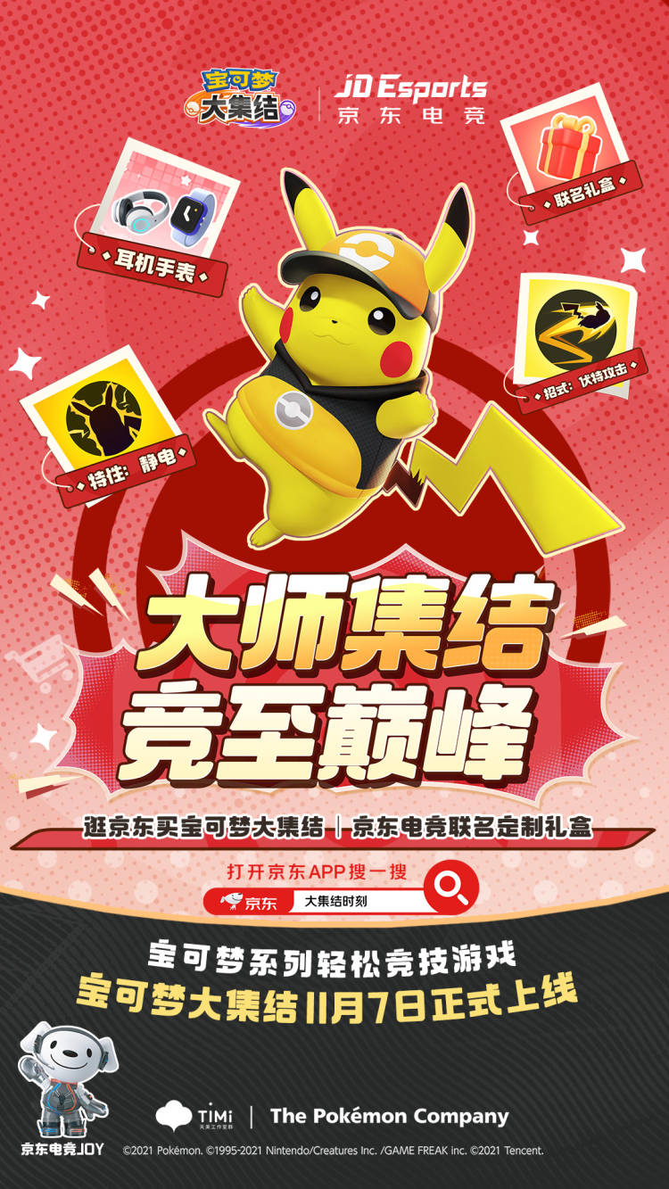 大师集结,竞至巅峰!宝可梦大集结 | 京东电竞携手给训练家送“京”喜啦,11月1日起,京东��【大集结时刻】,联名礼盒开售,元气宝可梦伴你欢乐“开黑”,更有全国线下10城裸眼3D大屏轮播开启,快快集结伙伴前去打卡吧~