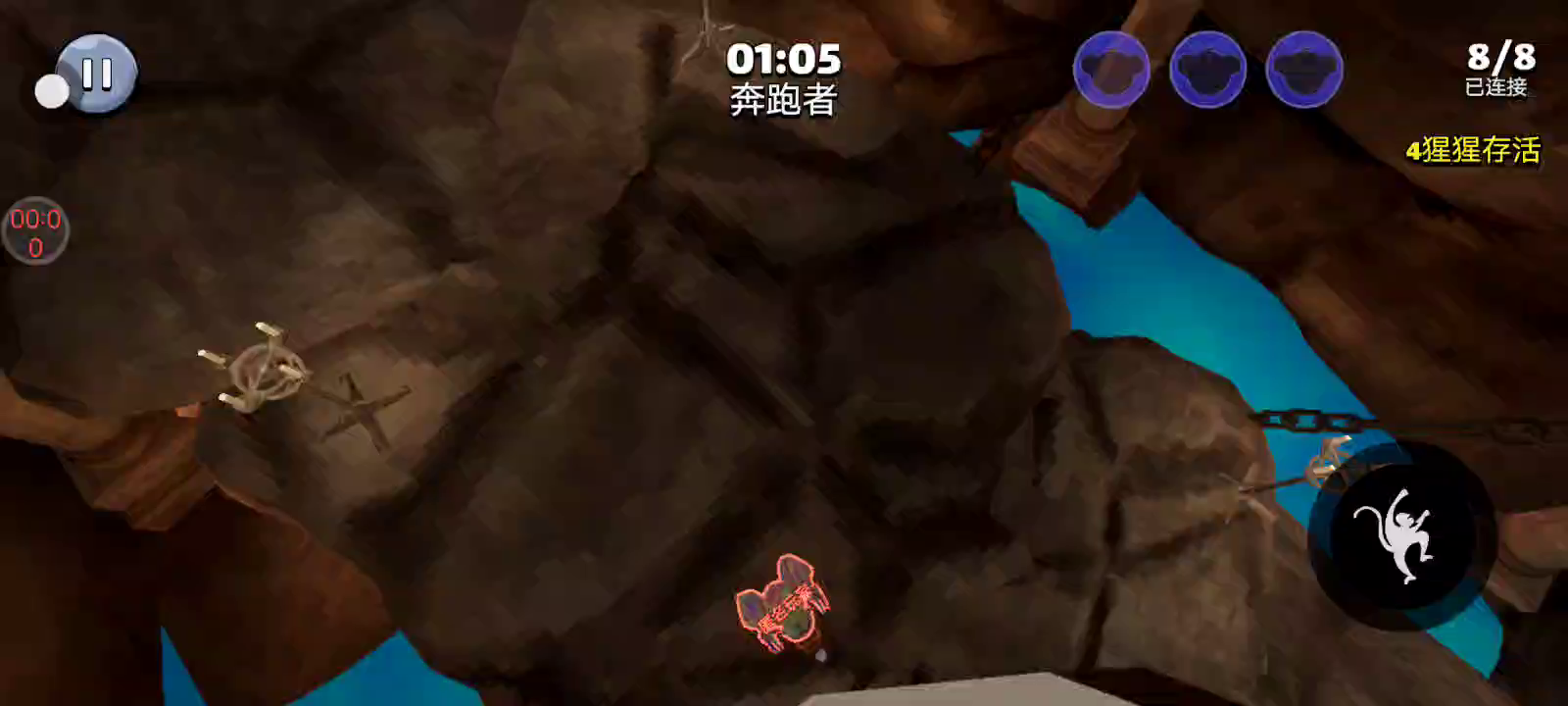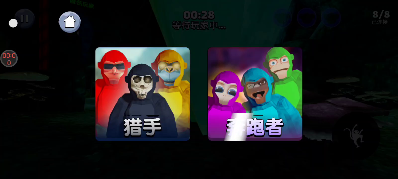 您可以扮演猎人大猩猩或奔跑猴子。在密室躲藏和寻找,尽可能多地生存。如果您是大猩猩猎人,则必须在 3 分钟内寻找并抓住所有其他奔跑者。如果您是奔跑者,则必须在不被抓住的情况下生存隐藏 3 分钟,如果您被抓住,则成为大猩猩猎人。