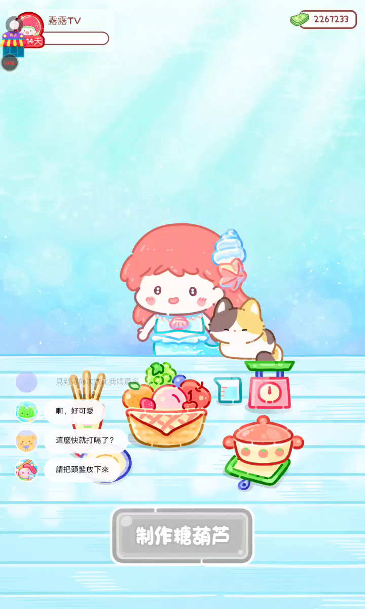 更新宠物!!! 「你进行草莓糖葫芦吃播的话,我就赞助100元。」 「脆口的声音太迷人了(°θ°)」 由于客人都被最近新开的许多糖葫芦店家抢走,曾经号称糖葫芦达人的父母因此卧病在床。 继承父母店面的主角露露开始糖葫芦吃播来宣传店面。 直到成为真正的糖葫芦达人那一天! 「今天我也要开始糖葫芦直播罗!( •o• )」 [串材料] 只有新鲜的水果的话,很难以一名吃播实况主存活下来。还要有松饼、地球软糖、青阳辣椒!利用奇特的材料制作糖葫芦吧。 [裹糖衣] 将材料串满竹签的话,就放进锅子搅动吧。唯有利用达人的秘法,才能裹出又薄又脆的糖衣。 [即时吃播] 咔哒咔哒!今天的吃播也大成功。热烈的聊天内容看起来反应也不错。看来得利用完成观众任务得到的赞助金来买新材料了! 来,准备好了吧?现在就马上挑战成为糖葫芦达人吧!